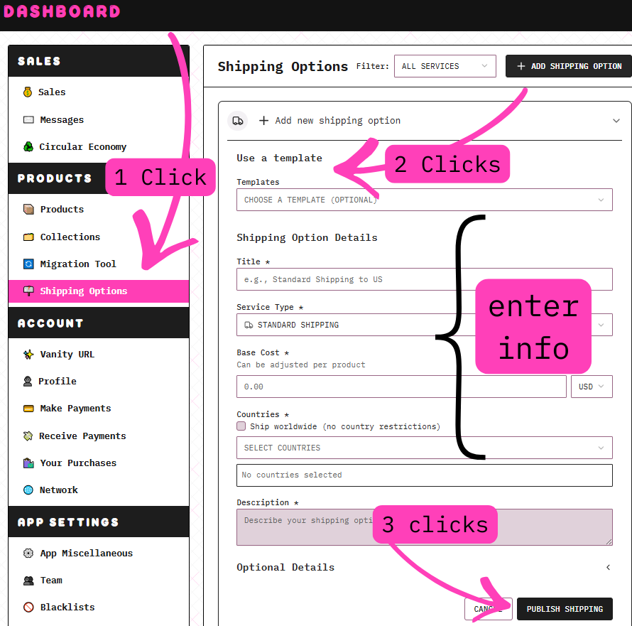 Click + Add Shipping Option (or use a template from the dropdown, like “Local Pickup”, “Digital Delivery” etc.)