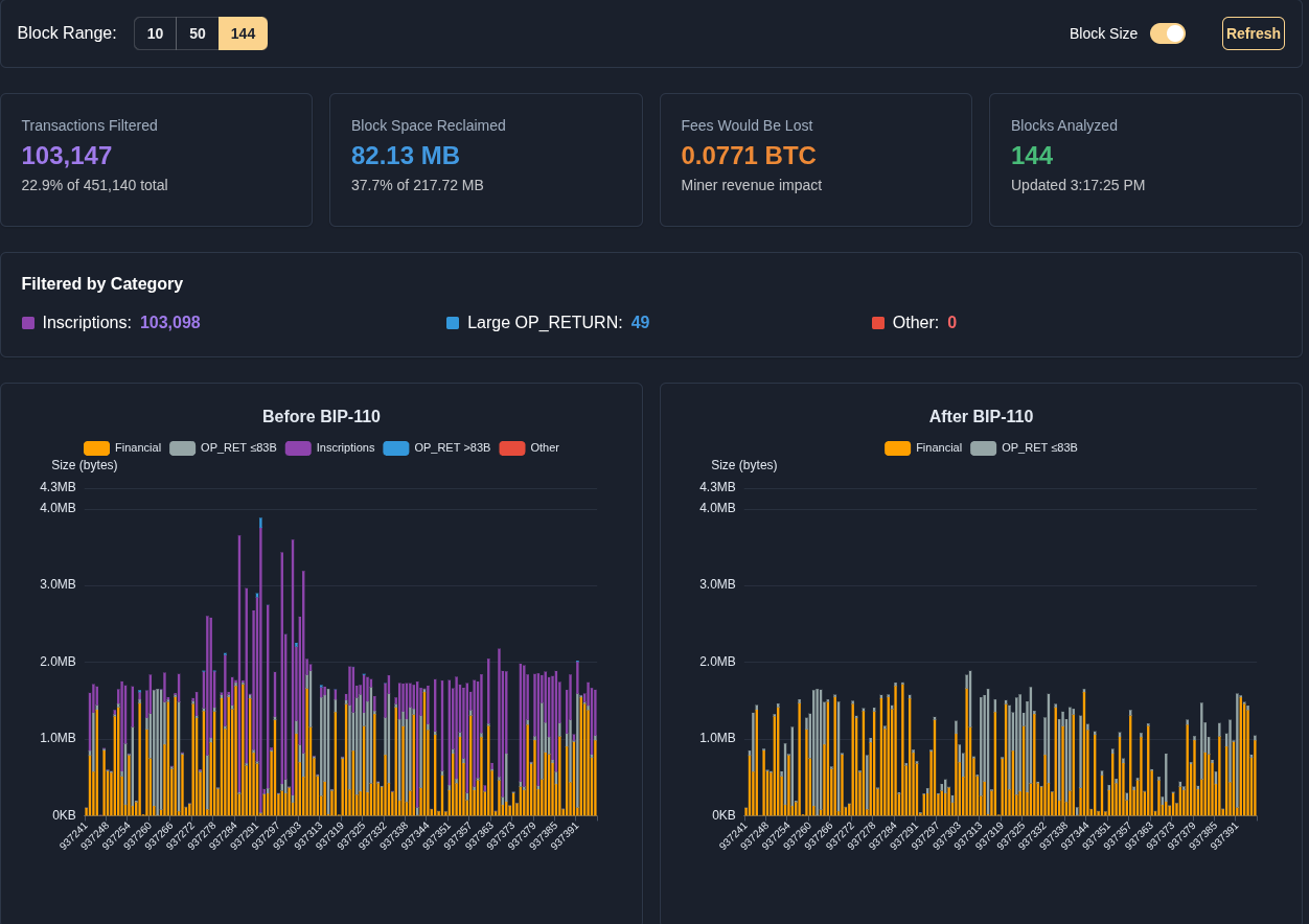 RamenCoffee · 1d Any sources you recommend for a layman to understand ? I need to both understand : 1- why is CSAM and spammers are an existential threat. As of now I'm unconvinced. 2-what are the impacts and cos... nostrich 1771618825 This real world transactions applied with BIP110 and without it.
