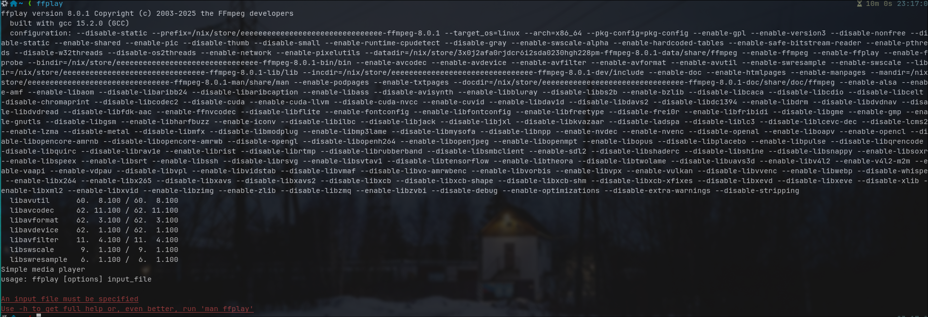 nostr:nprofile1qy2hwumn8ghj7un9d3shjtnyd968gmewwp6kyqpq35945zuy4zqg4xnfzqutx7tkt49ftjf2szhd299pn7xdwe070acqlem63r I suppose ffmpeg was compiled with these placeholder paths because a package hash and its library directory is unknown at build time?