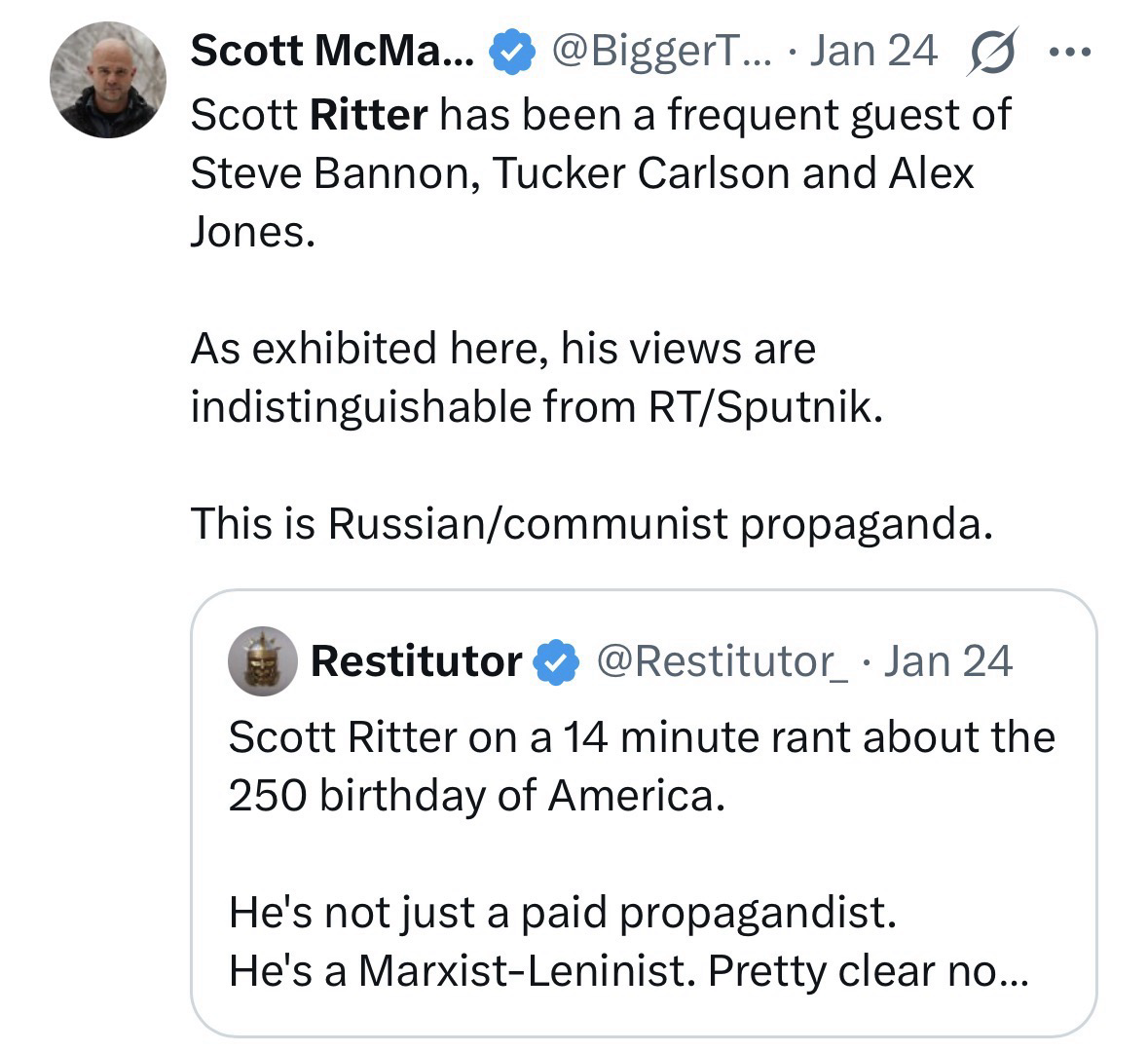 @nprofile1q... @nprofile1q... Why is Scott Ritter a reliable source? I noticed on x last 6 weeks that the Russians are definitely part of creating division and discord using white race issues, antisemitism, Jewish prejudice, and Israel bias. There’s definitely a psyop they are engaged in.