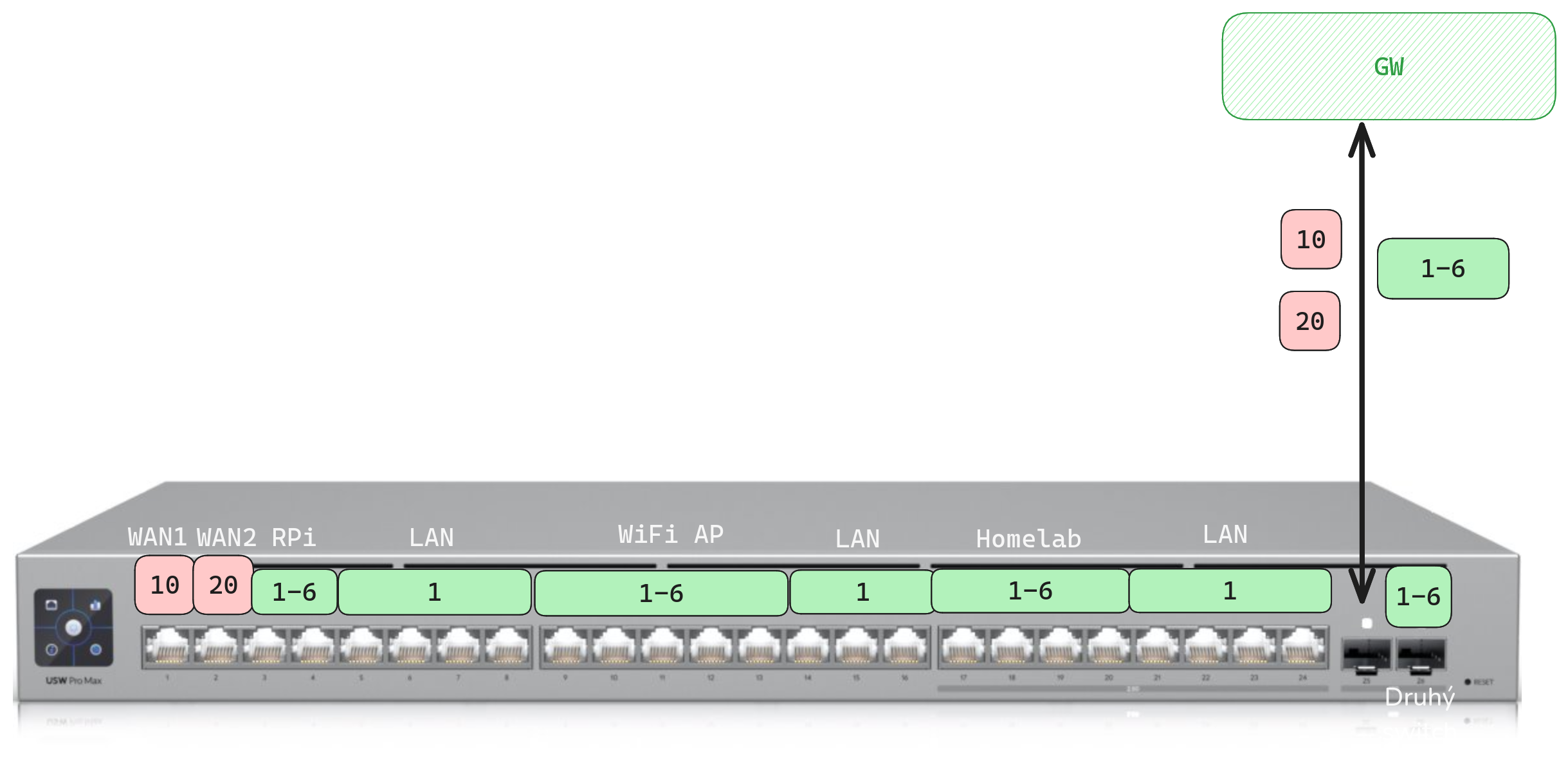 Teď se chystám ještě na jednu věc. Oba ISP chci zapojit do switche pod jejich vlastní VLANy, čímž GW zůstane připojená jen tou optikou a pokud se GW něco stane, tak půjde nahradit třeba virtuálním serverem v homelabu.