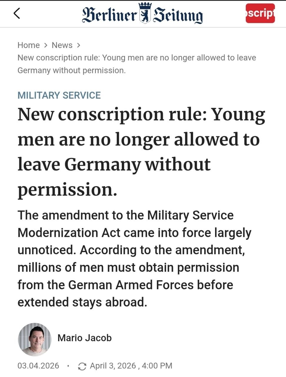 🇩🇪 Berliner Zeitung reports that men in Germany are now required to obtain official permission to leave the country.All males aged 17 to 45 must get approval from a Bundeswehr career center if they plan to stay abroad for more than three months, including for study, work, or long-term travel.