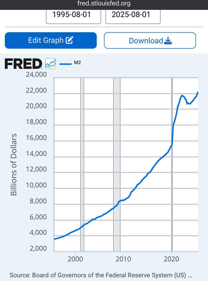 TFTC @TFTC 1759271151 The US M2 money supply has grown 618% over 30 years, an annualized 6.25% increase.Shared via https://pullthatupjamie.ai 1