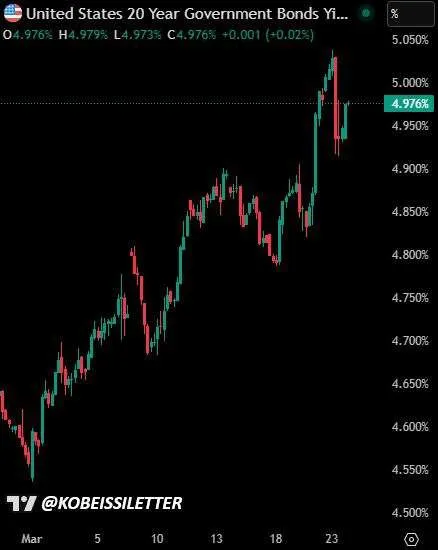 🇺🇸🇮🇷 The 20-year Treasury yield has snapped back to 5.00% within a day of Trump claiming peace talks had begun.Markets aren’t buying the narrative. Borrowing costs are surging, with mortgage rates pushing toward 7% and gas nearing $4.00.