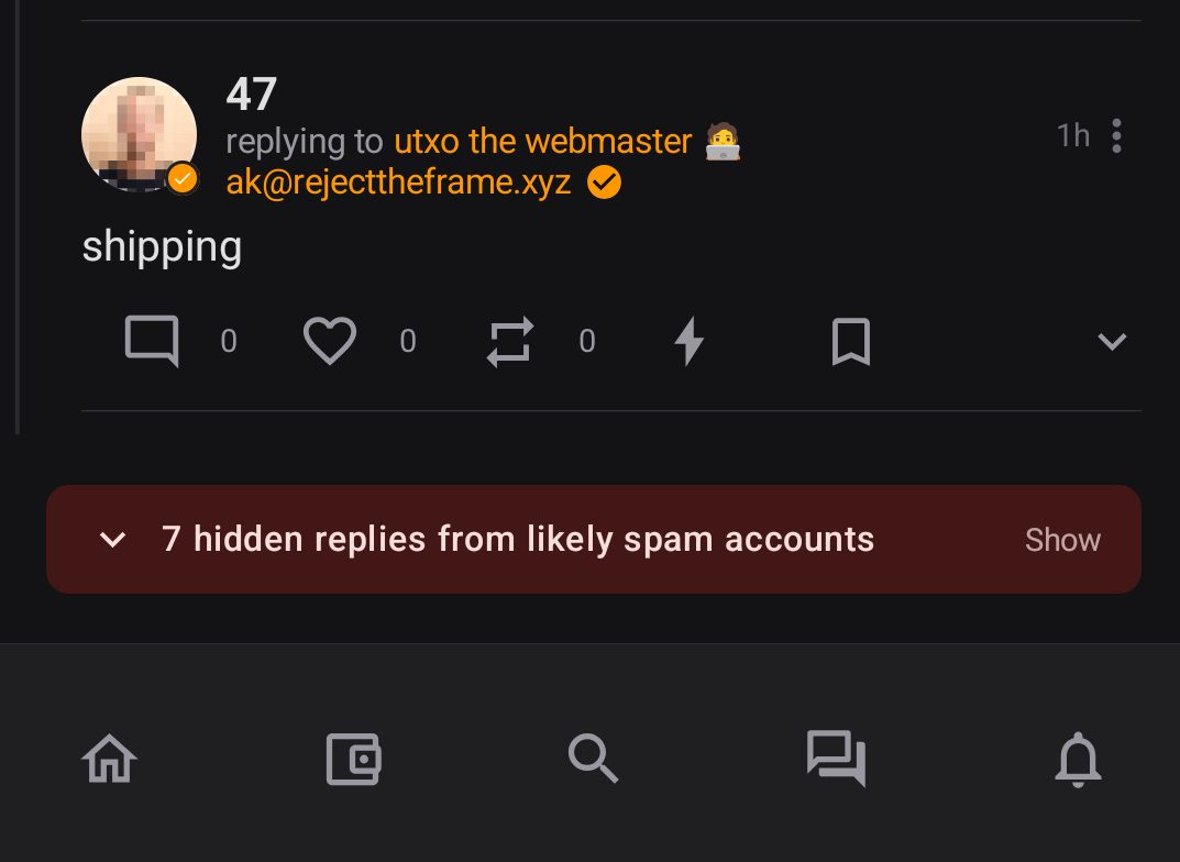 Sir Spencer - Wolf of KC πΊ · 1w Bro, it is making me violent. utxo the webmaster π§βπ» @utxo the webmaster π§βπ» 1776490557 Use wisp man we have AI that automatically blocks them all 1β€οΈ1π«1