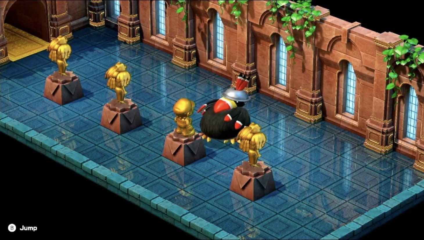 Either the remake developers didn’t notice this detail or had trouble making the helmet cover his eyes in 3-D, but his vision is unobstructed in this version, making it nonsensical that he doesn’t see Mario move.