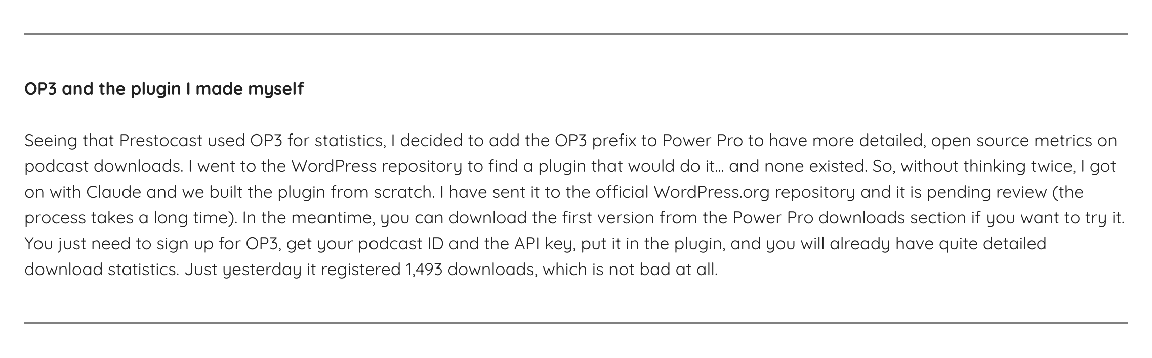 ‘You just need to sign up for OP3, get your podcast ID and the API key, put it in the plugin, and you will already have quite detailed download statistics. Just yesterday it registered 1,493 downloads, which is not bad at all.’