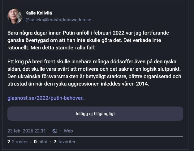 @nprofile1q...@nprofile1q...@nprofile1q... Nu har jag kollat lite mer. Alla gamla inlägg är markerade "Do not federate", förmodligen eftersom de är publicerade innan jag installerade ActivityPub-tillägget. Så vill jag att de ska funka på Mastodon får jag väl gå in för hand och ändra den inställningen innan jag sprider länken. Men än så länge är inlägget från 2022 fortfarande "ej tillgängligt" på Mastodonsweden.se.