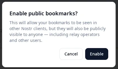 - Public bookmarks option is a modal that explains, "This will allow your bookmarks to be seen in other Nostr clients, but they will also be publicly visible to anyone — including relay operators and other users."